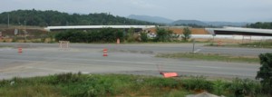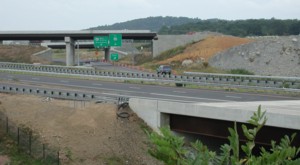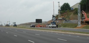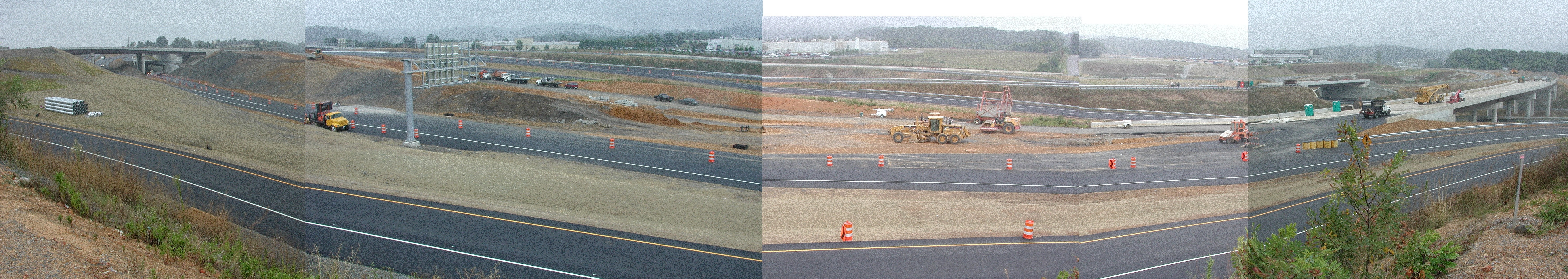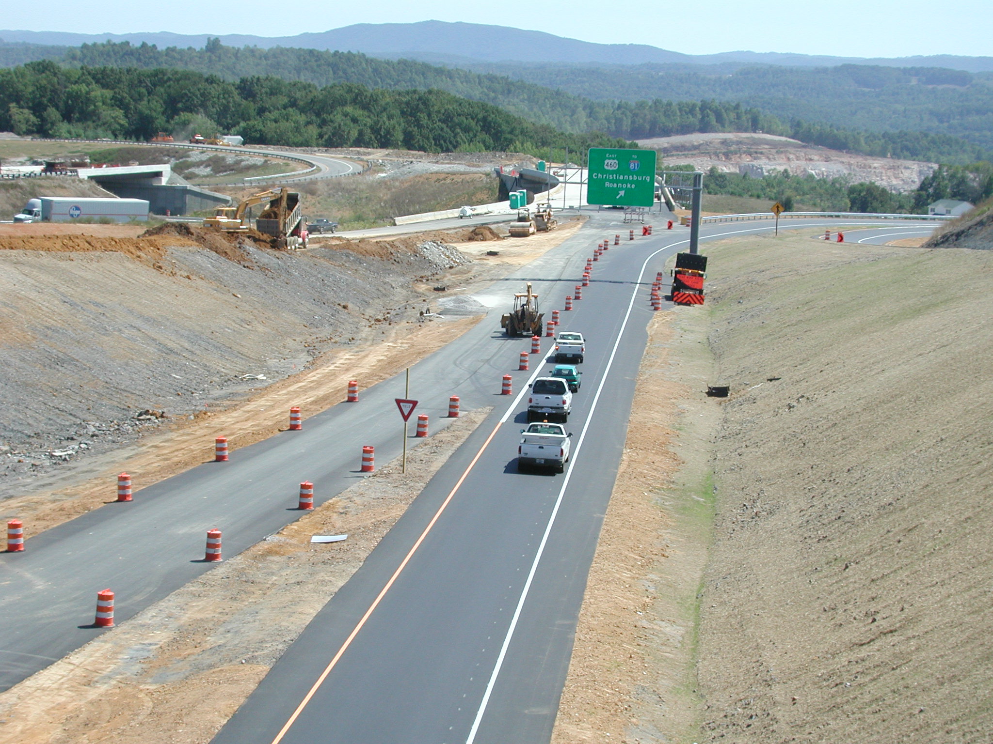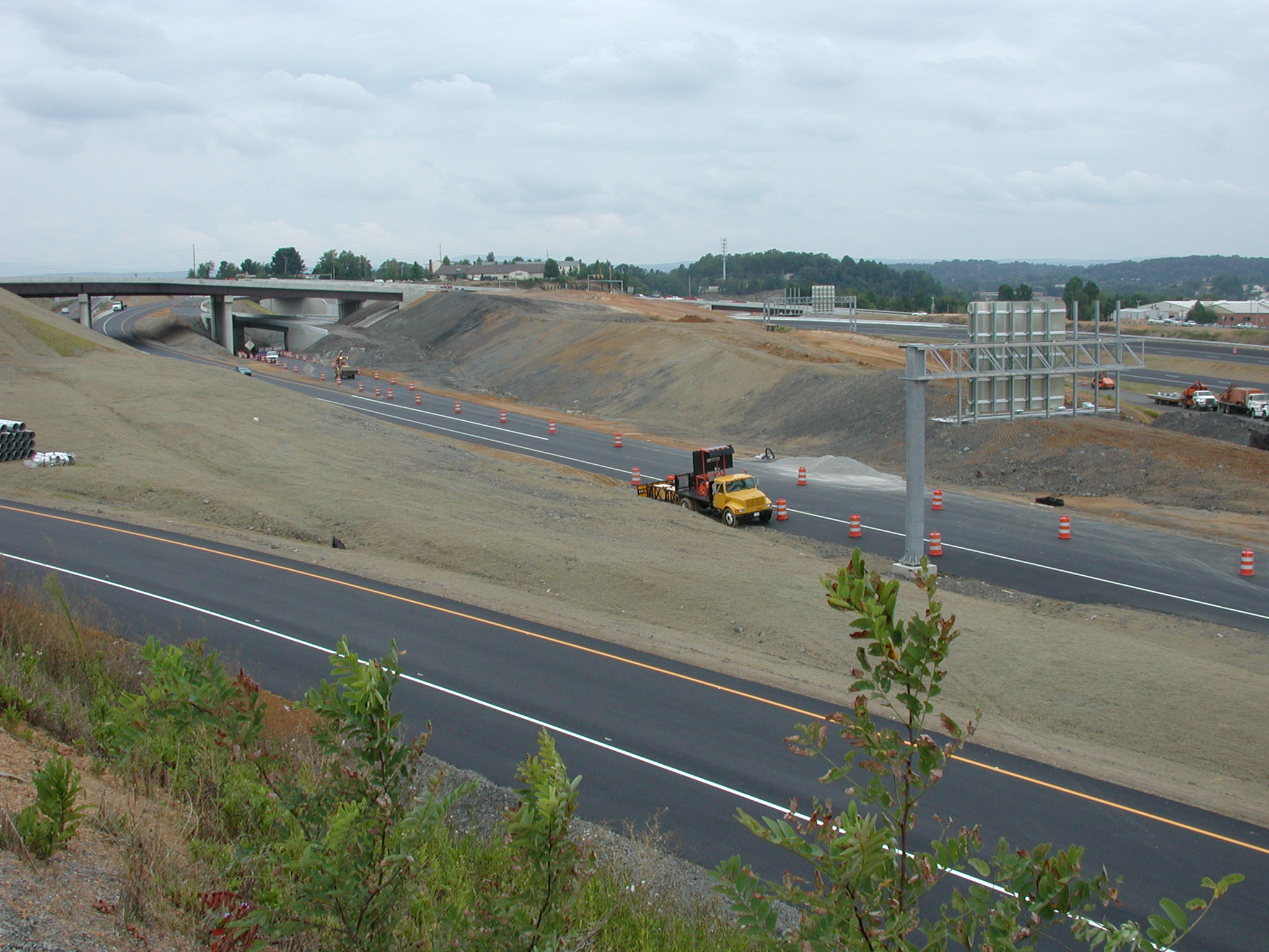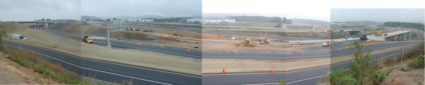 ![]() Christiansburg -- Looking west from the Yellow Sulphur Road overpass. The lanes in the foreground are eastbound U.S. 460 Bypass; the lane with the barrels is the acceleration lane for the ramps from North Franklin Street (U.S. 460 Business). The other lanes are U.S. 460 Bypass West and the exit ramp to U.S. 460 Business West. The overpass in the far distance will carry northbound North Franklin Street over the entrance and exit ramps, then the lanes will split into an on-ramp for westbound traffic to the bypass and and a continuation of North Franklin Street. |