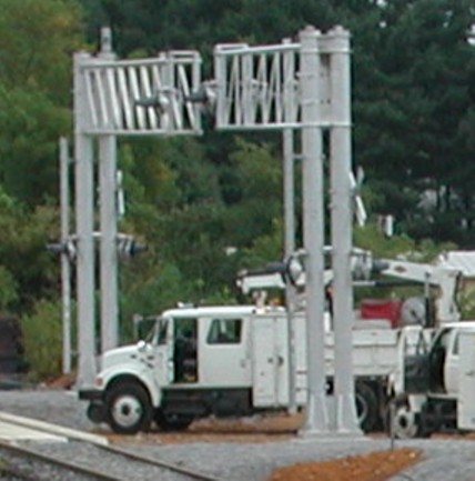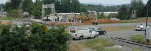 ![]() Christiansburg -- Looking northeast from Palmer Street at North Franklin Street. The new grade crossing over the Huckleberry (the Norfolk Southern "Blacksburg Branch" or "Gobbler Spur") is for the relocated northbound lanes of North Franklin Street. The present northbound lanes are located where the ramp from the U.S. 460 Bypass (which combines ramps from both westbound and eastbound traffic on the Bypass) will cross the track. The present southbound lanes of North Franklin Street will remain where they are, although with new crossing signals. There will be an additional lane crossing the track to the right of the southbound lane, carrying traffic directly to Cambria Street adjacent to the Christiansburg Recreation Center. (Here is a closeup of the crossing signal for the rail types.) |